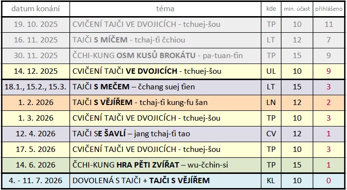 Zde najdete přehlednou tabulku plánovaných nedělních lekcí tajči a čchi-kungu. Můžete si nejen poznamenat do svých diářů, ale také se včas přihlásit.