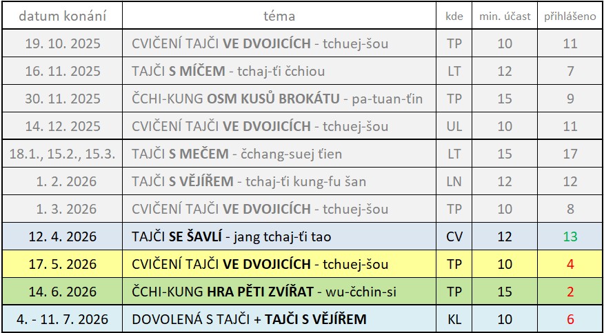 Zde najdete přehlednou tabulku plánovaných nedělních lekcí tajči a čchi-kungu. Můžete si nejen poznamenat do svých diářů, ale také se včas přihlásit.